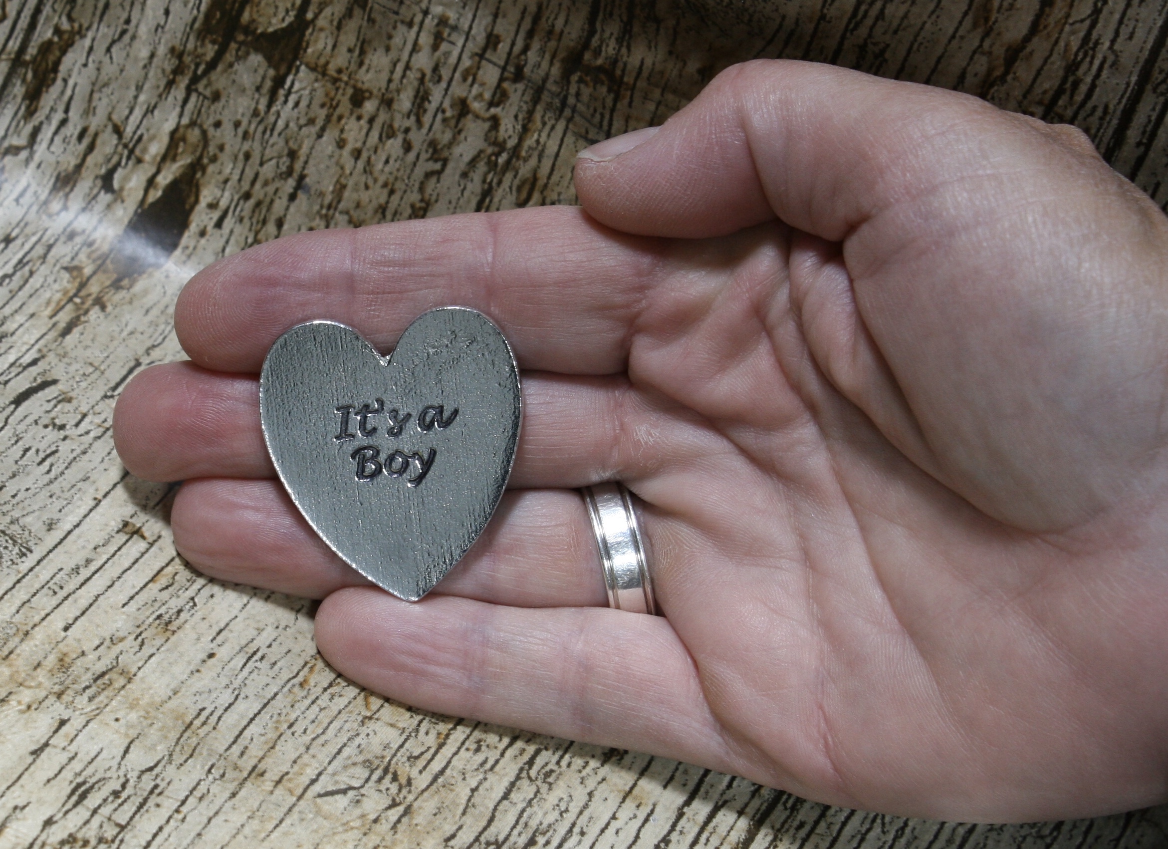 You will receive 1 Solid Pewter Heart shaped pocket token that reads It’s a Boy, attached to a Greetings Card.